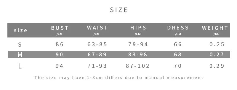 | Size | Bust (cm) | Bust (in) | Waist (cm) | Waist (in) | Hips (cm) | Hips (in) | Dress (cm) | Dress (in) | Weight (kg) |