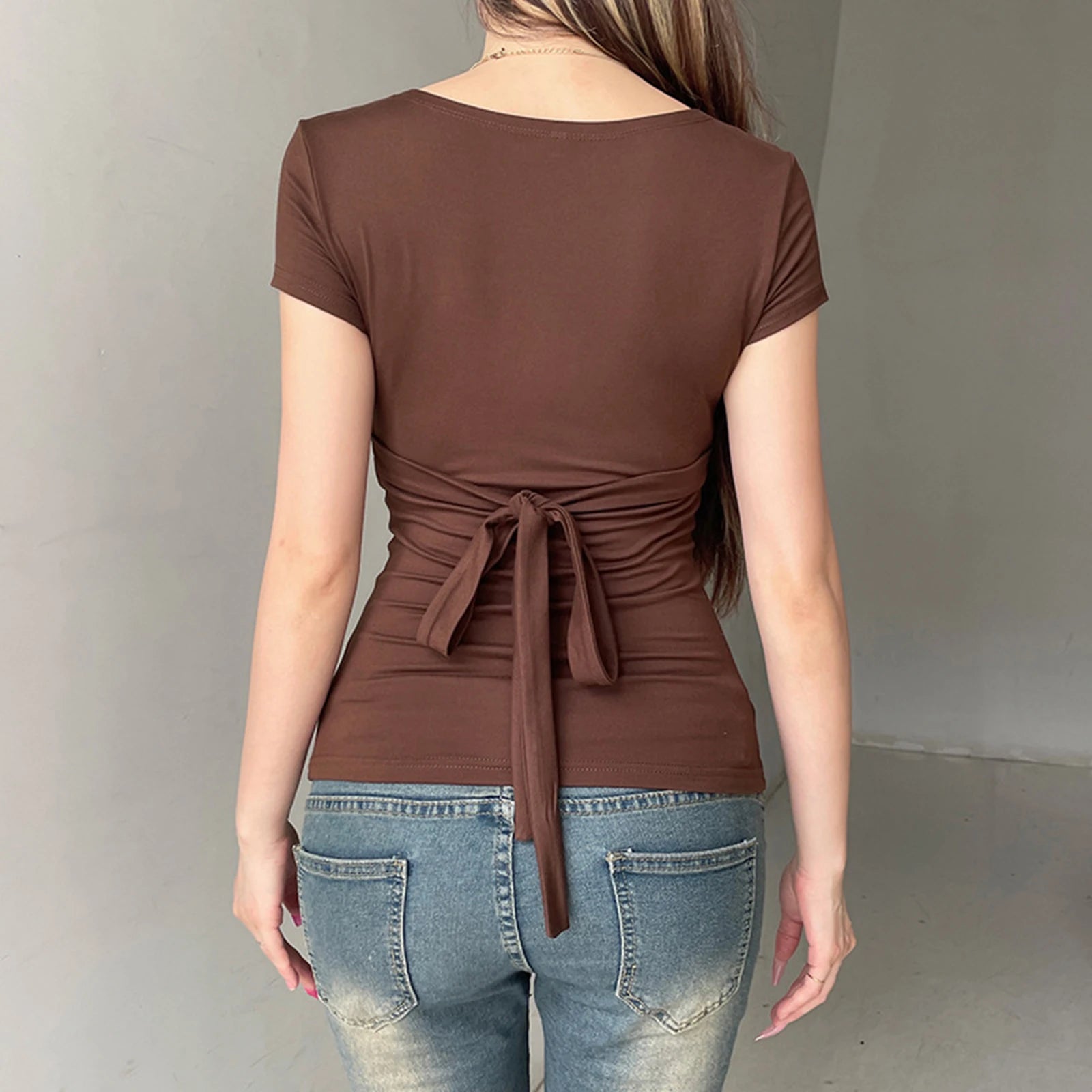 - Fitted silhouette with a structured empire seam and knotted front hem that grazes the waist