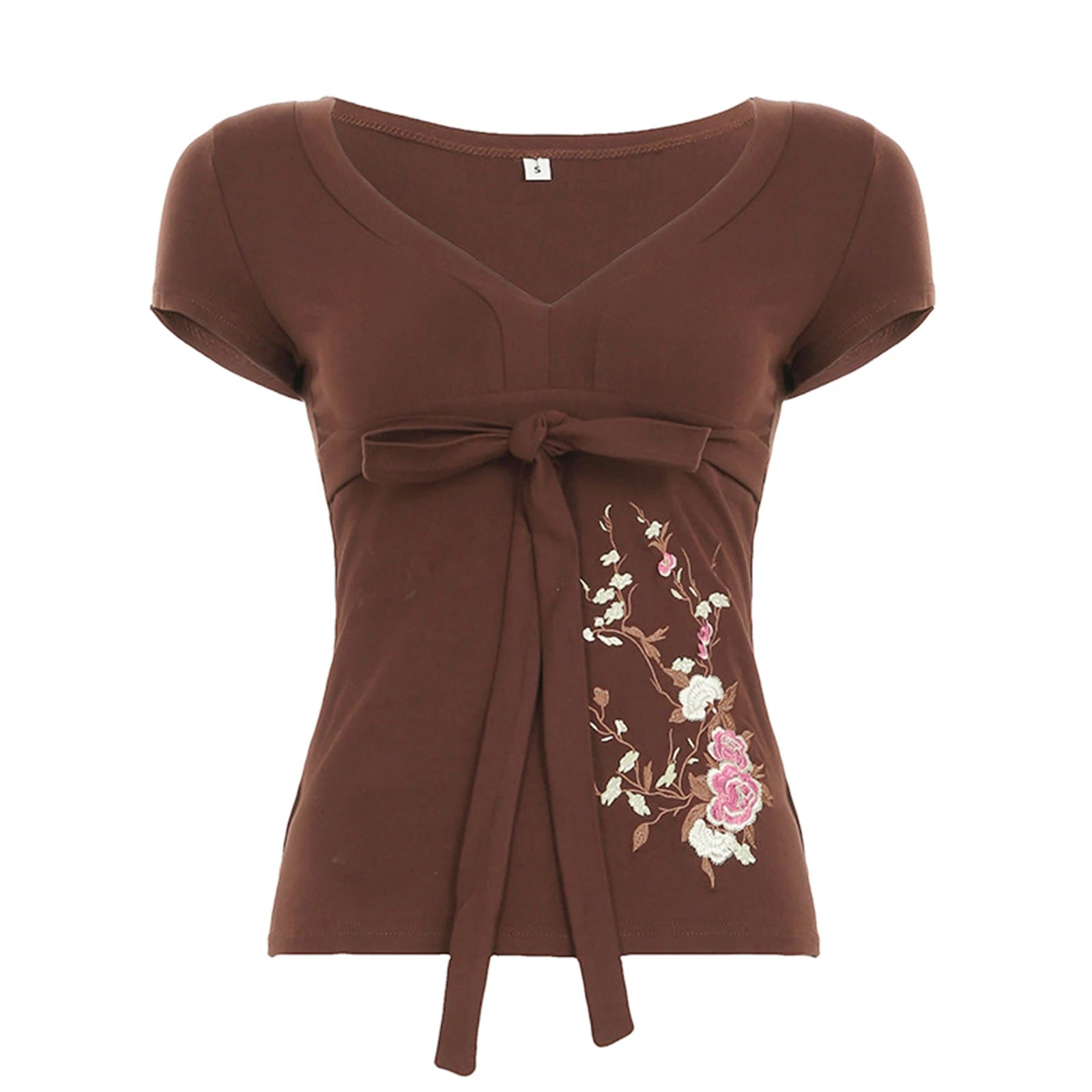 The colour of dark soil and dried petals, this fitted tee carries a quiet melancholy — the kind that blooms anyway. Cherry blossoms and roses climb the hem in soft embroidery, as if the garden refused to let go. Tied at the waist like a secret kept close.